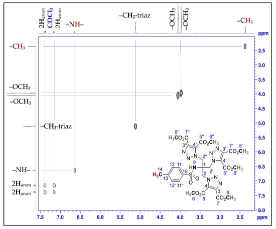 3.2. Synthesis of Tetramethyl 1,1′-(2-[{4,5-bis(Methoxycarbonyl)-1H-1,2,3-triazol-1-yl}methyl]-2-[(4-methylphenyl)sulfonamido]propane-1,3-diyl)bis(1H-1,2,3-triazole-4,5-dicarboxylate) (3)