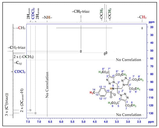 The chemical structure of compound (3) was elucidated by methods of spectroscopic analysis such as 1D and 2D-NMR experiments, infrared spectroscopy, and elemental analysis. The 1H NMR spectrum of the cycloadduct (3) showed the presence of two intense signals at 3.98 and 4.05 ppm corresponding to the 18 methyl protons of the ester groups. Also, the protons of the methylene group of compound (3), which resonate at 5.12 ppm, are more deshielded than those of the triazide derivative (2), which resonate at 3.52 ppm. All of this can be explained by the change in their chemical environment due to the tensions of the triazole rings. Furthermore, in the 13C-NMR spectrum of compound (3), the assignment of the signals appearing at about 159.14 ppm and 159.97 ppm to the quaternary carbons of the carbonyl groups, and those appearing at about 132.48 ppm and 139.57 ppm to the quaternary carbons of the 1,2,3-triazole ring, also confirm that the 1,3-dipolar cycloaddition reaction has taken place. In addition, the appearance of signals at approximately 52.89 ppm and 54.25 ppm in the case of the tris-triazole derivative (3) confirms the presence of methoxy groups of the ester function. The definite assignment of the chemical shifts of protons and carbons are shown in Table 1. The interpretation of the homonuclear and heteronuclear 2D-NMR spectra (Figure 1 and Figure 2) of the cycloadduct (3) showed a perfect correlation, proton-proton and proton-carbon 13.