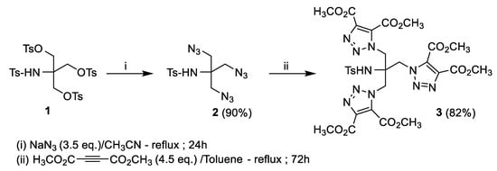 A new compound tetramethyl 1,1′-(2-[{4,5-bis(methoxycarbonyl)-1H-1,2,3-triazol-1-yl}methyl]-2-[(4-methylphenyl)sulfonamido]propane-1,3-diyl)bis(1H-1,2,3-triazole-4,5-dicarboxylate) (3) was prepared in two steps starting from 2-((4-methylphenyl)sulfonamido)-2-((tosyloxy)methyl)propane-1,3-diylbis(4-methylbenzenesulfonate) (1), with an overall yield of 74%. The key step being the copper-free Huisgen cycloaddition between N-(1,3-diazido-2-(azidomethyl)propan-2-yl)-4-methylbenzenesulfonamide (2) and commercially available dimethyl acetylenedicarboxylate. The chemical structure of compound 3 was determined by IR, 1D and 2D NMR experiments, and elemental analysis.