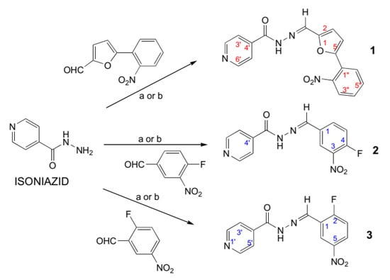 Synthesis of the Schiff bases of isoniazid. Conditions (a): absolute ethanol, acetic acid, microwave irradiation (5–10 W, 0–1 atm. pressure), 10 to 20 min, at 85 °C. (b) Absolute ethanol, acetic acid, and reflux 6–8 h.