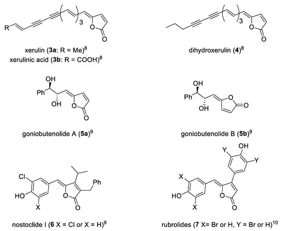 This structural moiety characterizes in turn a large class of bioactive natural products endowed by a wide range of biological activities, such as inhibition of cholesterol biosynthesis−xerulin (3a), xerulinic acid (3b) and diihydroxerulin (4)—[8], cytotoxicity−goniobutenolides A (5a) and B (5b) and nostoclides (6)—[9], antimicrobial activity−rubrolide (7)—[10]. Some of these representative γ-alkylidenebutenolide are reported (Figure 2).