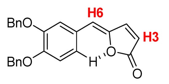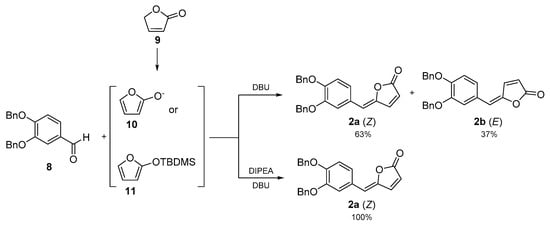 Although the E-isomers are less stable than the Z-counterparts, in the absence of a β-substituent the formation of Z-isomers remains small [11]. Therefore, traditional synthetic strategies including alkylidenation of preformed oxacycles as butanolides and 2-silyloxyfurans, to the best of our knowledge, are nonstereoselective [12]. Alternative methods offer stereochemical predictability and high level of selectivity but need stereodefined precursors, chiral ligands, or removable stereocontrol elements [13,14,15]. Since the biological activity of compounds featuring a γ-alkylidenebutenolide is due to this core, we focus our attention on preparing the 5-(3′,4′-bis(benzyloxy)benzylidene)furan-2(5H)-one via a stereocontrolled reaction (2a Z-isomer, 2b E-isomer; Scheme 1).