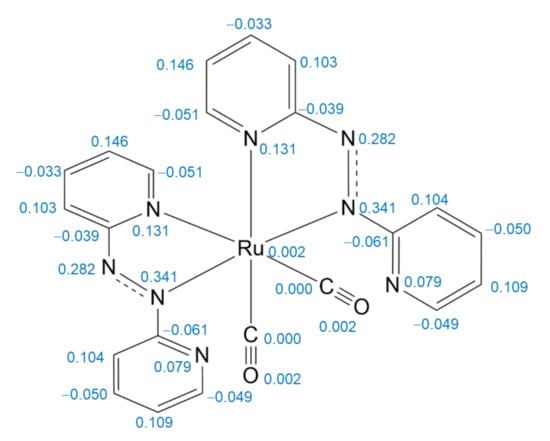 We previously reported the detailed characterization, including X-ray crystallography, of the monocarbonyl complex ([Ru(pap)2(CO)Cl]+) []. In this report, we confirmed that the two azo ligands were neutral in the monocarbonyl complex. Meanwhile, two carbonyl stretching frequencies in the newly prepared dicarbonyl complex were observed at 2060 and 1995 cm−1 in the IR spectra (Figure S1). These values are 30–40 cm−1 lower than those of similar Ru complexes ([Ru(N-N)2(CO)2]2+; N-N = bidentate pyridyl ligands) [,,]. The reason is that the reduction of the azo moiety increases the electron density of the complex, resulting in a red shift of the CO bands []. Additionally, no peaks assignable to the present complex were observed in the mass spectra, and its 1H-NMR spectrum was silent. It is, therefore, interpreted that the introduction of two CO molecules, which function as ligand and reducing agents, led to the selective formation of the diradical neutral complex, in which both the azo ligands underwent one-electron reduction (Equation (1)).