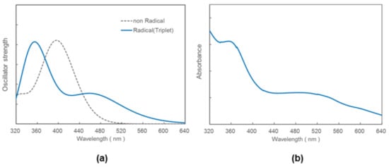(a) The theoretical absorption spectra calculated for the singlet and triplet spin configurations of [Ru(apy)2(CO)2]2+/0 at the TDDFT/B3LYP/LanL2DZ/6-31G(d) level of theory; (b) The absorption spectrum of [Ru(apy·−)2(CO)2].