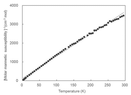 To experimentally confirm that the present complex is a radical complex with unpaired spins, we carried out measurements of the dependence of the magnetic moment on the external magnetic field (M-H properties). Since M = χH (M: magnetic moment, H: external applied magnetic field, χ: magnetic molar susceptibility) is satisfied within the temperature range measured, the complex is the radical complex, which displays paramagnetic properties. Additionally, the Curie–Weiss law defined by Equation (2) (C: Curie constant, T: absolute temperature, θ: Weiss constant) is satisfied in the low-temperature region bearing on the temperature dependence of the magnetic susceptibility (the applied magnetic field of 10000 Oe) as shown in Figure 4; the Weiss constant is negative (θ = −10.7 K), suggesting that antiferromagnetic interactions exist between the spins in each radical [].
