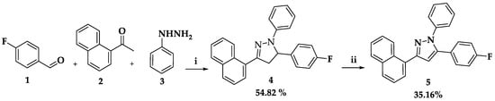 3.3. Synthesis of 5-(4-Fluorophenyl)-3-(naphthalen-1-yl)-1-phenyl-1H-pyrazole 5