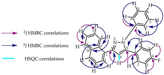 The assignment of each signal in 1H and 13C NMR was performed based on the 2D NMR spectrum, including HSQC and HMBC. The HSQC spectra showed that C4 (δ 108.91 ppm) only had a correlation with H4 at δ 6.83 ppm. This shows that there was a loss of one proton caused by oxidative aromatization of pyrazoline core. Then, the HMBC spectra of compound 5 showed an important correlation between H4 at δ 6.83 ppm with C3 and C5 signals in pyrazole core. The other important correlations were illustrated in Figure 2. The 1D and 2D NMR spectrum were completely attached in Supplementary Materials.