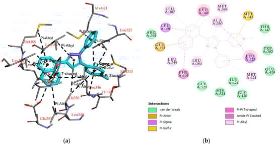 The interactions of compound 5 with active sites of ERα; (a) 3D visualization; (b) 2D visualization.