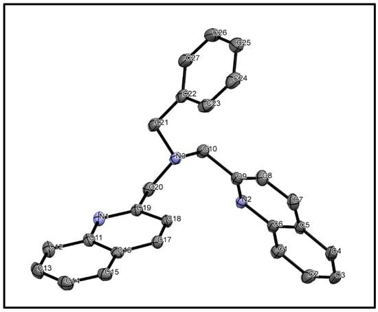 Bis(2-pyridinylmethyl)amines (bpmas) (type I) and their closely related analogues, bis(2-quinolinylmethyl)amines (bqmas) (type II) are versatile tridentate N-donor ligands that form mononuclear metal complexes with flexible five-membered chelates [,,,,,,]. Bis(2-quinolinylmethyl)benzylamine (1), a derivative of the bqma ligands with an appended benzyl group at the amine position, was first reported by Kryatov et al. []. However, its crystal structure has not been reported to date. In that report of Kryatov et al. [], 1 was used together with other iso-structural ligands for stabilizing dinuclear complexes with a common Fe(II)(μ-OH)2 core. Soon after, Kunishita et al. [] used this ligand for the synthesis of Cu(II) complexes. More recently, Li et al. [] synthesized monomeric Ni(II) and Cu(II) complexes of 1 and studied their binding affinity to CT-DNA and bovine serum albumin (BSA) to infer their potential as anticancer therapeutics.