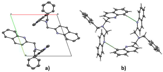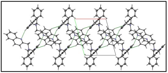 Compound 1 crystallizes in the triclinic system of the P-1 space group. The unit cell comprises two molecules of 1 linked by two complementary hydrogen bonds to form an inversion dimer. The monomers are linked by two complementary hydrogen bonds between the atom (the hydrogen bond acceptor, q = quinoline ring) and the C′1H′1 (hydrogen bond donor) on the benzo ring of the quinoline ring of an adjacent molecule of 1 to form a cyclic supramolecular motif in the ab plane, as shown in Figure 3. The H′1 atom is at a distance of 2.732 Å from the atom of its dimer partner. This bond distance is significantly shorter than the sum of the van der Waals (VdW) radii of the interacting nuclei, but is not quite linear (with an ∠C1-H1…N1 of about 151.30°, see Table 2) as would be expected for an ideal dipolar H-bond. Inclusive of the two complementary hydrogen bonds, the loosely-held and puckered supramolecular cyclic motif of the dimer comprises 22 bonds, whose monomers are related by an imposed center of inversion. Similar structural packing in the solid, stabilized by dimeric conformations in the solid-state, has been reported for structurally related compounds [,,].