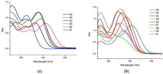 Absorption spectra of the monoarylated DPDTEs (2a–f) (a) and diarylated DPDTEs (3a–i) (b) at 298 K in CHCl3 solution (C = 10−5 M).