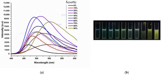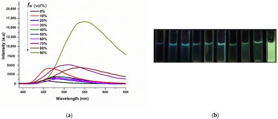 The aggregation-induced emissions of 2b and 2e are shown in Figure 3 and Figure 4, respectively. A common feature of the electronic absorption spectra of the monoarylated DPDTEs is a set of three absorption bands characteristic of aromatic rings with intense and well-resolved absorption bands in the UV region (250–450 nm). However, spectrum 2c has only two absorption bands in the spectrum cut-off. The ester is the weakest electron-withdrawing-group of the considered substituents, and 2c’s three absorption bands do not shift to the longer wavelength as much as some other monoarylated DPDTEs do. Therefore, the band with the shortest wavelength falls outside the range of the screenshot diagram. Diarylated DPDTEs showed only two bands from 250 to 450 nm. This difference is due to the more symmetric structure of the diarylated derivatives in comparison to the monoarylated ones. Among those monoarylated DPDTEs, those with strong EWGs, such as 2b, 2d, 2e, and 2f showed increase in absorption intensity as well as in absorption wavelength due to the reduced-energy band gap between HOMO and LUMO of the molecules. Compound 2e showed amazing fluorescence with increasing emission intensity: about 16-fold, from zero to about 17,500 a.u., while the percentage of water reached 90%. The emission color of 2e changed from blue to yellow and could be easily observed under UV light. In addition, its wavelength shifted from 450 to 545 nm, while for compound 2b, when the H2O ratio was increased, there was a gradual shift in emission wavelength. Interestingly, the color intensity increased from 2000 to 9000 a.u and was then reduced to 8200 a.u due to the quenching (ACQ) effect of aggregation. This aggregation may have been assisted by the hydrogen bonding of the gem-diol, which resulted from adding a water molecule to the aldehyde functional group.