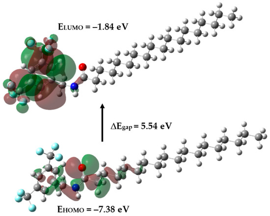 The geometry optimization of the N-(3,5-bis(trifluoromethyl)benzyl)stearamide 3 was performed using density functional theory (DFT), employing Becke’s three-parameter hybrid function with the nonlocal correlation of Lee–Yang–Parr (B3LYP) method with 6–311+G(d,p) basis set in gas phase. Theoretical calculations were performed by DFT using Gaussian 16 [34,35,41]. The molecular visualization, optimized geometry, and molecular electrostatic potential were obtained using GaussView 6.0.16. The multiwfn algorithm was used for these calculations. It should be noted that DFT calculations were performed for the prediction of chemical stability and reactivity of amide 3 with the help of quantum chemical descriptors such as frontier molecular orbitals and HOMO–LUMO energy gap, as well as global reactivity descriptors such as potential (IP), electron affinity (EA), electrophilicity index (ω), chemical potential (μ), electronegativity (χ), and hardness (η). The molecular electrostatic potential (MEP) analysis is presented as a powerful tool for the knowledge of charge distribution, and its results can be useful in determining how amide 3 molecules could interact with each other.
