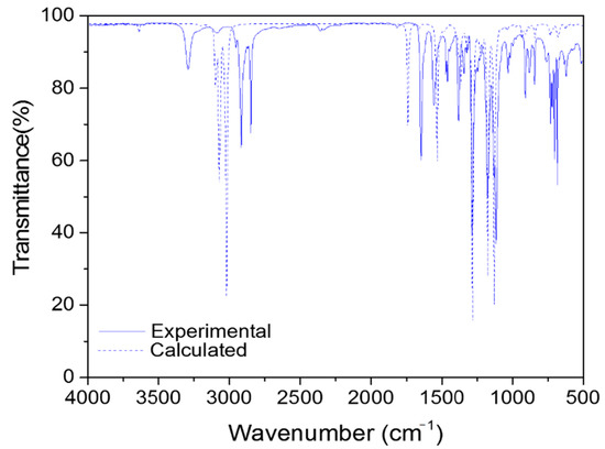 For visual comparison, a superposition of experimental and calculated [B3LYP/6–311+G(d,p)] FT-IR spectra is illustrated in Figure 4. The vibrational frequencies from DFT calculations are often overestimated and commonly scaled by empirical factors. A scaling factor of 1.0 was used in this study to fit the calculated frequencies to the experimental ones. For the amide 3, the most relevant computed scaled frequencies attributed to N–H and C=O stretching vibrations were 3642.71 and 1739.37 cm−1, while experimental frequencies were observed at 3290.54 and 1647.48 cm−1, respectively. Moreover, the computed scaled frequencies attributed to C–N–H in-plane deformation and C–N stretching vibrations were 1536.04 and 1280.41 cm−1, while experimental frequencies were assigned at 1557.52 and 1285.09 cm−1, respectively. Ultimately, absorption bands at 1174.98 cm−1 (νas C–F) and 1115.40 cm−1 (νs C–F) were observed for CF3-containing amide 3, while the calculated scaled vibrations were assigned at 1169.85 and 1123.66 cm−1, respectively.