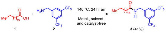 We report a metal- and catalyst-free synthesis of N-(3,5-bis(trifluoromethyl)benzyl)stearamide 3 by a direct amidation reaction between equimolar amounts of stearic acid 1 with 3,5-bis(trifluoromethyl)benzylamine 2 at 140 °C for 24 h under solvent-free conditions, as depicted in Scheme 1. It should be noted that the water vapor condensed on the walls of the open-topped tube was removed with a small piece of cotton attached to a spatula to displace the equilibrium towards amide formation. After the specified reaction time, the mixture was allowed to cool to ambient temperature, and the resulting crude product was purified by flash chromatography on silica gel using a mixture of DCM/MeOH (100:1, v/v) as eluent to furnish the fatty acid amide 3 in 41% yield. Conceptually, the condensation reaction between a carboxylic acid and an amine is the most attractive and practical synthetic approach to form the amide bond via the expulsion of a molecule of water. Nonetheless, the amide 3 was isolated in moderate yield (41%) because the innate acidity of the stearic acid and the basicity of the 3,5-bis(trifluoromethyl)benzylamine can generate ionized forms that limit its thermal condensation. Despite the moderate yield, the collateral formation of substituted ammonium carboxylate salt was not detected by thin-layer chromatography (TLC) and 1H NMR spectroscopy. In consequence, the releasing of water as the unique by-product gives to this approach a remarkable eco-friendly quality. It should be noted that the synthesis and full characterization of amide 3 have not been reported on Reaxys and SciFinder databases. For that reason, a full spectroscopic and analytical characterization was performed in this work (see Section 3 and Figures S1–S5). The IR, 1D NMR, and MS spectra and elemental analysis suggest that the structure of the isolated white solid corresponds to the amide 3. Furthermore, 2D HSQC, HMBC, and COSY experiments permit the assignment of all proton and carbon atoms, confirming the proposed structure for amide 3 without ambiguity (see Supplementary Material).