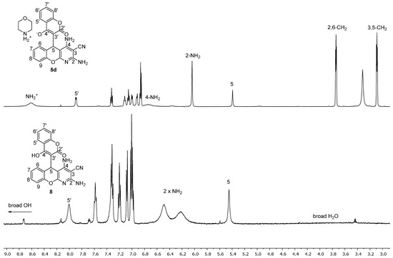 The 1H NMR spectrum of compound 8 (Figure 1, bottom spectrum) showed a very broad signal from the proton of the OH-group at 12.3 ppm due to exchange with water and, probably, tautomerism. For the same reason, protons in the immediate neighborhood of the hydroxyl group (H5, H5’) produced broadened signals in the spectrum. Protons of amino groups also produced wide signals.
