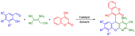 We previously carried out a multicomponent transformation of salicylaldehydes, 2-aminoprop-1-ene-1,1,3-tricarbonitrile and 4-Hydroxy-2H-chromen-2-one into 5-(4-Hydroxy-2-oxo-2H-chromen-3-yl)-5H-chromeno[2,3-b]pyridines [11] (Scheme 1).