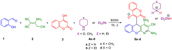 Four-component reaction of salicylaldehyde 1, 2-aminoprop-1-ene-1,1,3-tricarbonitrile 2, 4-Hydroxy-2H-chromen-2-one 3 and amines 4a–d 1.