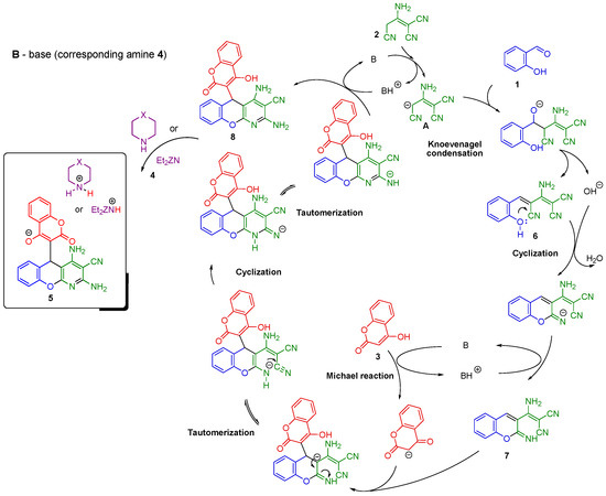 Taking into consideration the results of the 1H NMR monitoring of the Pot, Atom and Step Economy (PASE) reaction of salicylaldehydes, malononitrile dimer and hydroxyquinolinone [12], the following mechanism for the four-component reaction of salicylaldehyde 1, 2-aminoprop-1-ene-1,1,3-tricarbonitrile 2, 4-Hydroxy-2H-chromen-2-one 3 and amines 4a–d was proposed, as shown in Scheme 3.