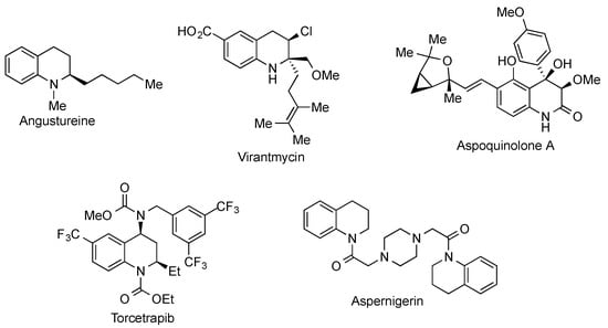 The 1,2,3,4-tetrahydroquinoline ring system is present in a broad variety of natural products and synthetic bioactive molecules [1,2] and can be considered as one of the most relevant simple heterocycles. Some important tetrahydroquinolines are summarized in Figure 1, including the alkaloids angustureine, virantmycin and aspoquinolone A, the cholesterol-lowering agent torcetrapib and the insecticidal, herbicidal and fungicidal aspernigerin (Figure 1).