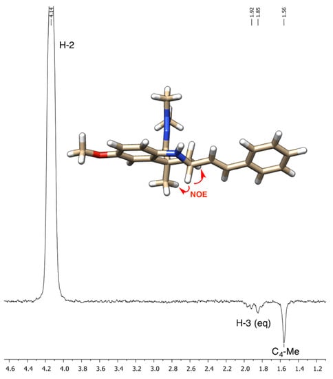 The structure of compound 5 is consistent with a high-resolution mass measurement and with its IR, 1H-NMR and 13C-NMR spectral data, which were assigned with the aid of 2D-NMR experiments. Thus, the hydrazone group gave a CH=N stretching vibration at 1600 cm−1 in the IR spectrum, a 1H-NMR signal in the 6.74–6.64 interval, which overlapped with other signals but is clearly visible in the HMQC experiment, and a 13C-NMR signal at 145.3 ppm. One of the olefinic protons was clearly observed at 6.27 ppm as a doublet of doublets with J = 15.8 and 7.3 Hz, which allowed its assignment as H-α. The other proton corresponding to the olefin part of the styryl group (H-β) is part of the multiplet at 6.74–6.64, as revealed by the COSY experiment, and the H-C correlation experiments allowed the assignment of the olefin carbons to the CH signals at 132.4 (C-α) and 131.0 (C-β). The cis arrangement of the styryl and dimethylhydrazono substituents agrees with the literature precedents [6,7] and was unequivocally established by the observation of a NOE enhancement of the axial C-4 methyl substituent upon irradiation of the H-2 proton (Figure 2). The alternative trans isomer was not observed in the crude reaction product.