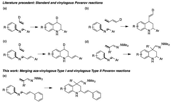 (a) The standard Povarov reaction; (b) type I vinylogous Povarov reaction; (c) type II vinylogous Povarov reaction; (d) type I aza-vinylogous Povarov reaction; (e) the reaction described in this work, which combines the features of the type I aza-vinylogous and type II vinylogous Povarov reactions.