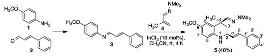 The doubly vinylogous Povarov reaction that we describe here is summarized in Scheme 2. The reaction between p-anisidine 1 and cinnamaldehyde 2 afforded the corresponding imine 3, which was treated in crude state with methacrolein dimethylhydrazone 4 in acetonitrile containing 10% indium trichloride as a Lewis acid catalyst, at room temperature, affording compound 5 as a single diastereomer in 40% overall yield (Scheme 2).