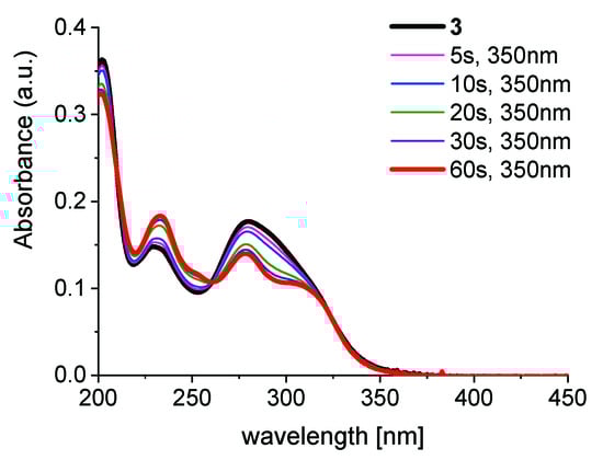 The photochromic behavior of 3 was studied in diluted acetonitrile solutions using different excitation wavelengths. As shown in Figure 2 for 350 nm excitation, the UV-absorption of 3 is rapidly changing after few seconds with hypochromic shifts at 290 and 270 nm (negative photochromism [17]) and an isosbestic point at 258 nm. No further changes in the absorption spectrum could be observed after 1 min and prolonged irradiation for several hours did not lead to further changes.