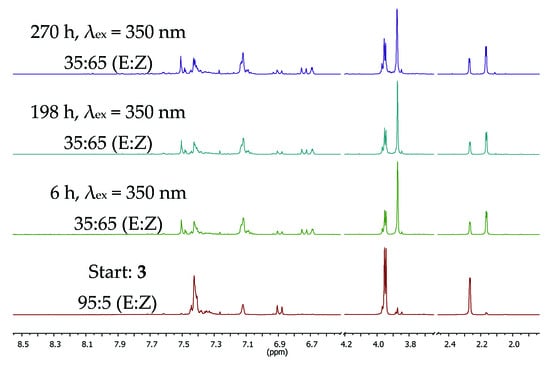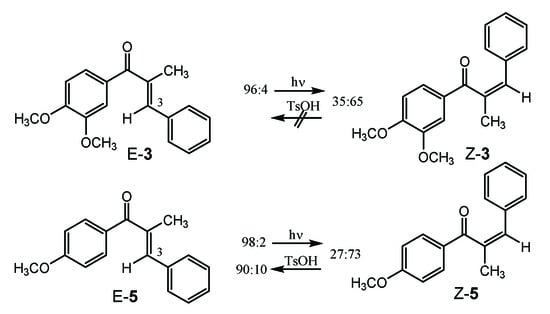 From the UV-absorption analyses at different excitation wavelengths and quantum yield determinations at 344 nm, the data shown in Table 1 resulted. The PSS that were determined by NMR spectroscopy (see Figure 3) approach unity at shorter wavelength. The low PSS makes compound 3 not a useful representative of the α-methylated chalcones which usually can be switched to PSS > 29:71, e.g., compound 5 [16] and, more important, back-switched to the initial E/Z-mixture be treatment with Broensted acids (Scheme 4, [16]). The quantum yields for forward and backward switching for compound 3 were determined by the QYD-system as developed by Riedle and coworkers [18]. The Z→E switch process is more efficient than the E→Z switch at 344 nm and the PSS originates from the differences in ελ for the E- and Z-isomers, respectively, following the relation PPS = [ελ (E) × ΦλE→Z/ελ (Z) × ΦλZ→E].