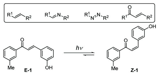 Photochromic molecules have a long tradition in history of chemistry [1]. Initially only an optical curiosity, photochromism developed into a highly productive and technically applicable phenomenon [2]. Compounds that behave photochromically are currently used in very different fields of applications ranging from photo-pharmacology [3,4,5], signaling, and sensing to information storage materials [6,7,8,9]. The general concept is the light-induced unimolecular switch of a molecule to a thermodynamically less stable configurational or constitutional isomer that is coupled with a back reaction that can be also light-induced or purely thermal [7]. Variations that are more complex in applications involve bimolecular processes, such as the addition or release of singlet oxygen [8]. Possible mechanisms for the return process to the initial states beside photochemical (P-type) and thermal (T-type) are Lewis- or Broensted-acid catalysis or changes in solvent properties, ion strength, or other physical parameters [9,10]. The structurally most versatile processes are cis/trans (E/Z) photo-switches that can involve CC-, CN-, or NN-double bonds as central switching units (alkenes, imines, azo compounds) [11,12]. A typical example for a P-type E⮀Z-switch with biological relevance is shown in Scheme 1 [13]: E-chalcone 1 shows antitumor-activities that are largely increased in the Z-configuration. A strong increase in pharmacological properties was also described for the electronic ground states of α-methylated chalcones in comparison with the non-methylated analogs [14]. We became therefore interested in photo-switch properties of these α-methylated chalcones [15] and their stability against singlet oxygen, a reactive oxygen species that often increases system fatigue in the photo-switching processes [16].