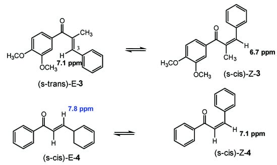 Configurational and conformational switching of the α-methyl chalcone 3 and the parent chalcone 4.