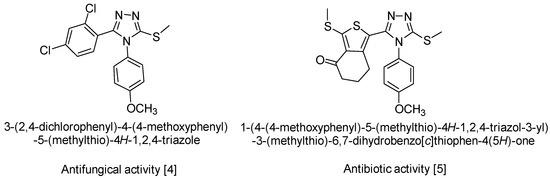 The recent literature reveals that the mercapto- and thione-substituted 1,2,4-triazole moieties should be an important structural feature of a wide range of synthetic medicines [1]. A variety of medicinal actions have been reported, ranging from anti-tubercular action [2] to protein inhibitory action involved in the mechanism of diseases such as diabetes, obesity and cancer [3]. Other S-alkylated compounds derived from 4H-1,2,4-triazole-3-thiol 4,5-disubstituted show proven antifungal [4], antimicrobial and antibiotic activity [5] (Scheme 1).