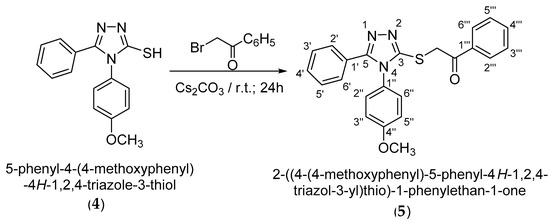 Following alkylation using cesium carbonate as a base in N,N-dimethylformamide, it has been observed that the alkylation occurs exclusively at the thiol group as S-alkylation. This is observed from 2D NMR spectroscopic analysis by analyzing the couplings over two to three bonds in the HMBC spectrum as well as by the shifting of the signal of the triazolic carbon 3-C atom to a lower δ value at 151.7 ppm, corresponding to a thiol type carbon atom. S-Alkylation of 4-(4-methoxyphenyl)-5-phenyl-4H-1,2,4-triazole-3-thiol (4) was carried out using 2-bromo-1-phenylethanone in DMF in the presence of Cs2CO3 at room temperature. 2-{[4-(-4-Methoxyphenyl)-5-phenyl-4H-1,2,4-triazol-3-yl]thio}-1-phenylethan-1-one (5) resulting from S-alkylation was obtained in a yield of 79% after recrystallization from ethanol (Scheme 4).
