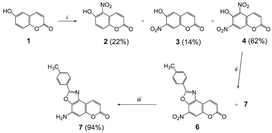 The reaction of 4 with p-tolylmethanol (5) in a sealed tube in toluene in the presence of Au/TiO2 (4 mol%) at 150 °C led to 4-nitro-2-(p-tolyl)-7H-chromeno[5,6-d]oxazol-7-one (6) (45% yield) accompanied by 4-amino-2-(p-tolyl)-7H-chromeno[5,6-d]oxazol-7-one (7) (13%). This reaction was performed in analogy to our recent work on the synthesis of fused oxazolocoumarins by the treatment of o-hydroxynitrocoumarins with benzyl alcohol catalyzed by Au/TiO2 or Ag/TiO2 or FeCl3 [21]. During this process, a simultaneous reduction of nitro- to amine-group and oxidation of benzyl alcohol to benzaldehyde occurred, followed by imine formation from the amine and benzaldehyde, cyclization by addition of hydroxy-group to imine and oxidation of the intermediate oxazoline to oxazole. The selective reduction of the 5-nitro group of coumarin in comparison to the 7-nitro group by the intermediate gold-hydride [21] could be attributed to a possible complexation of gold to the 3,4-double bond of coumarin. In the 1H-NMR spectrum of 6, there are two doublets at 6.42 (1 H, J = 9.6 Hz) and 8.28 (1 H, J = 9.6 Hz) for the 3-H and 4-H, respectively, and one singlet at 8.30 (1 H) for the 8-H. The chemical shift of 4-H (8.28 ppm) is downfield in comparison to 4-H (7.69 ppm) of compound 4 due possibly to de-shielding from the oxazole-ring. The p-tolyl-group gave rise to the two doublets at 7.35 (1 H, J = 7.9 Hz) and 8.15 (1 H, J = 7.9 Hz) and one singlet at 2.43 (3 H). The HR-MS is m/z [M + H]+ calcd for C17H11N2O5: 323.2789, found: 323.2791.