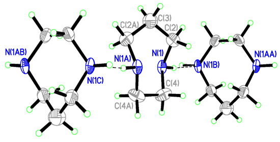 Crystal data for C5H12N2, M = 100.16 g mol−1, colourless prism, crystal dimensions 0.10 × 0.10 × 0.10 mm3, tetragonal, space group I–42d (No. 122), a = b = 7.208(2), c = 23.094(7) Å, α = β = γ = 90.00°, V = 1199.9(6) Å3, Z = 8, Dcalc = 1.109 g cm−3, T = 93 K, R1 = 0.0637, Rw2 = 0.1633 for 536 reflections with I > 2σ(I), and 37 variables, Rint 0.0374, goodness of fit on F2 1.137. Data have been deposited at the Cambridge Crystallographic Data Centre as CCDC 2049324. The data can be obtained free of charge from the Cambridge Crystallographic Data Centre via http://www.ccdc.cam.ac.uk/getstructures (accessed on 30 March 2021). The structure was solved by direct methods and refined by full-matrix least-squares against F2 (SHELXL Version 2018/3 [38]).
