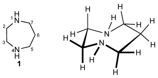 The fundamental heterocyclic compound hexahydro-1,4-diazepine or “homopiperazine” 1 was first reported in 1899 [1,2] and a convenient industrial preparation was described in 1961 [3]. At present, it is commercially available from several major suppliers and it has recently found various applications, including as a component of liquids for CO2 capture [4] and as a component of various organic and organic/inorganic supramolecular ionic salts and transition metal complexes. In these latter applications, the materials are often characterised by X-ray diffraction and so there are a large number of X-ray structures involving a homopiperazinium dication in salts or mixed salts with, for example, carboxylic acids [5,6,7], potassium perchlorate [8], ammonium perchlorate [9], manganese sulfate oxalate [10], cobalt sulfate [11], zinc phosphate [12], arsenic oxide [13], tellurium phosphate [14], cadmium phosphate [15], cadmium chlorides [16,17], lead bromide [18], bismuth iodide [19], uranium fluoride [20] and uranium sulfate [21]. There are also a significant number of structures in which homopiperazine acts as a bidentate ligand on nickel [22,23], copper [24] and platinum [25,26,27,28]. However, in all of these, the structure is significantly distorted either by protonation or metal complexation, and it appears that the X-ray structure of homopiperazine on its own has not so far been determined, quite possibly because its low melting point of 42 °C [2] makes it difficult to obtain suitable crystals. We have now determined its structure and present here the result as well as several key NMR parameters.
