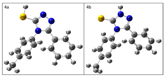 It can be seen from Table 1 that the value of 159.79 ppm of the chemical shift calculated for carbon atom 1C (experimentally numbered 3-C) for structure 4b (thione form) is the closest to the value of 168.6 ppm determined experimentally. It is also observed that the difference between the calculated chemical shift values for 4a and 4b for carbon atoms 1C (experimentally numbered 3-C) of 17.81ppm (159.79 ppm − 141.98 ppm) is similar to that between carbon atoms 3-C in compound 4 and that in S-alkylated compound 5, 168.6 ppm − 152.1 ppm = 16.5 ppm. Moreover, the experimentally determined chemical shift value for the 4-N nitrogen atom from the 2D HMBC 1H-15N spectrum of 183.9 ppm is very close to the experimentally calculated 190.79 (32N).