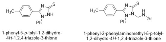 Nowadays, the 4,5-disubstituted-3-mercaptotriazolic nucleus is considered an important element in the synthesis and design of bioactive compounds, which are associated with numerous biological activities. Some of these biological activities are cytotoxic against different cell lines [9]: antibacterial, antifungal [10,11] (Scheme 2), anti-HIV [12] and anti-inflammatory [13,14].
