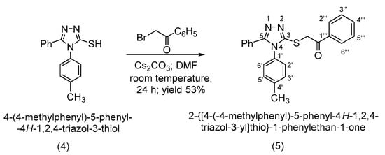 3.2. Synthesis of 2-{[4-(4-Methylphenyl)-5-phenyl-4H-1,2,4-triazol-3-yl]thio}-1-phenylethan-1-one (5)