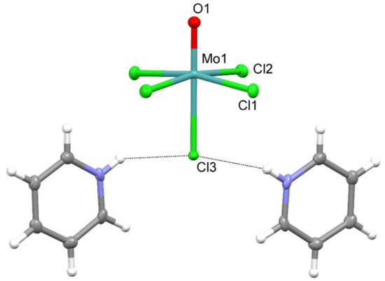 The solid-state structure of pyridinium pentachloridooxomolybdate(V) consists of the mononuclear [MoOCl5]2− anions and protonated pyridine molecules as countercations. Although part of the [MoOCl5]2− ion resides on the twofold rotation axis, its symmetry is that of the C4v point group. The drawing of the formula unit is shown in Figure 1, and relevant geometric parameters of the [MoOCl5]2− ion are listed in Table 1.