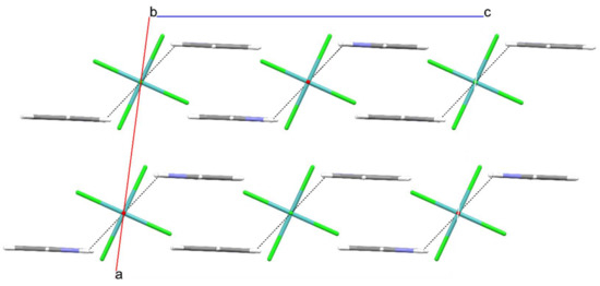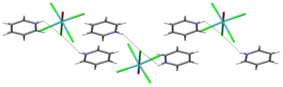 It should be noted that the lengthening of the Mo(1)–Cl(3) bond is a joint result of the operating trans influence of the molybdenyl moiety and the engagement of the Cl(3) chloride in hydrogen bonding with pyridinium cations. Cl(3) forms two hydrogen bonds with two pyridinium cations, with the N(1)∙∙∙Cl(3) contacts being 3.092(3) Å, a significantly shorter distance than the sum of the N and Cl van der Waals radii, 3.3 Å [10]. Such connectivity is known as a bifurcated hydrogen bond. The pattern, the [MoOCl5]2− ion with two hydrogen-bonded pyridinium cations, is shown in Figure 1. These hydrogen-bonded clusters interact with adjacent ones via π∙∙∙π stacking interactions occurring between pairs of pyridinium cations (Table 2, Figure 2 and Figure 3).