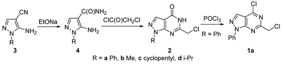 The only representative of 1-substituted 4-chloro-6-(chloromethyl)-1H-pyrazolo[3,4-d]pyrimidines, 1-phenyl derivative 1a was obtained by the reaction of carboxamide 2a with POCl3 [5]. Pyrimidinones 2 were prepared by a two-step synthesis, including saponification of 5-amino-1H-pyrazole-4-carbonitriles 3 to 5-amino-1-phenyl-1H-pyrazole-4-carboxamides 4 followed by reaction with choloroacetyl chloride [5,6,7,8] (Scheme 1).