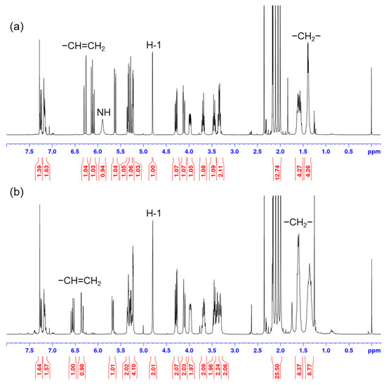 1H NMR spectra of (a) N-hexyl α-d-acetylmannosyl acrylamide (2) and (b) N,N-bis(hexyl α-d-acetylmannosyl) acrylamide (3).