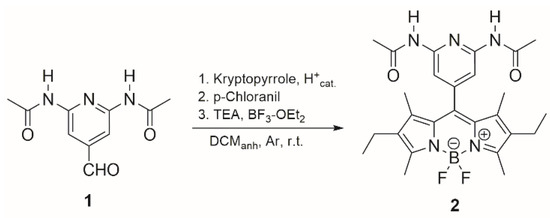 In this communication, the synthesis of a BODIPY from 3-ethyl-2,4-dimethyl-1H-pyrrole (kryptopyrrole) and 2,6-diacetamido-4-formylpyridin is reported. The procedure involves the sequential one-pot addition of the various reagents. Kryptopyrrole (2.2 eq), aldehyde 1 (1 eq) and few drops of trifluoroacetic acid (TFA) in anhydrous dichloromethane (DCM) are added and the mixture was stirred for 4 days at room temperature in argon atmosphere. Then, a solution of p-chloranil (1 eq) in DCM is added to the mixture causing the solution to turn dark red. Triethylamine (TEA) (9 eq) is added and after 30 min an ethereal solution of BF3 (6 eq) is added and stirred for 24 h. After extraction and purification by chromatographic column, 5-(2,6-diacetamidopyridin-4-yl)-kryptoBODIPY or DAAP-KBD 2 is separated with a yield of 20% as a dark red solid (Scheme 1).
