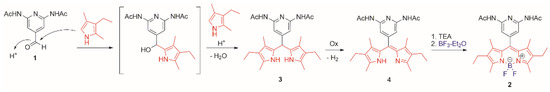 It is widely recognized that the BODIPY synthetic mechanism passes through the formation of two intermediates, dipyrromethane derivative and dipyrromethene and finally the complexation of BF3 [8]. Scheme 2 shows the plausible mechanism of the synthesis of DAAP-KBD 2, in line with what is already known.