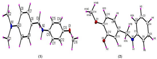 All solvents and chemical reagents such as p-anisidine, aniline, 4-(dimethylamino)benzaldehyde, 3-hydroxy-4-methoxybenzaldehyde were obtained from Sigma Aldrich and used as obtained without further purification. The 1H and 13C NMR spectra were recorded on a Bruker (Billerica, MA, USA) Avance III 400 MHz spectrometer. The proton and carbon shifts are quoted in ppm relative to the solvent signals. FTIR spectra were recorded in the region 4000 to 650 cm−1 using a Cary 630 FTIR spectrometer (Agilent Technologies, Santa Clara, CA, USA). Single mass analysis was carried out using the Waters Micromass LCT Premier TOF-MS (Waters, Milford, MA, USA). The spectra are presented in Supplementary Figures S1–S8. Single crystal X-ray crystallography of the compounds were recorded on a Bruker (Billerica, MA, USA) APEX-II CCD diffractometer.
