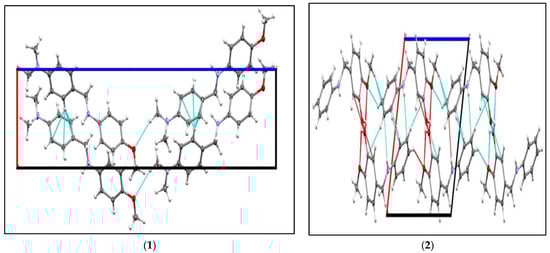 The molecular structures of 1 and 2 are presented in Figure 1. The crystal data and structure refinement are presented in Table 1 while the packing diagrams are presented in Figure 2. The molecular structures of both compounds consist of a monomeric unit in the asymmetric unit. Compound 1 consist of N,N-dimethylaniline and methoxyphenylamino moieties while 2 consist of phenylamino and phenol moieties. The phenyl rings in both compounds lie in distinct planes with dihedral angles of 73.89° for 1 and 86.61° for 2 between the planes (Figure 3). Compound 1 is involved in intermolecular C11—H11···N2 hydrogen bonding (C11···N21 = 3.463(4) Å); symmetry operation of 11/2 + x, − y, + z. The hydroxyl group of 2 is involved in intermolecular hydrogen bonding arising from O2—H2···O2 (methoxy oxygen of the neighboring molecule) and O2—H2···O21 (hydroxyl oxygen of the neighboring molecule), with O2···O11 = 2.8885(15) Å and O1···O21 = 2.9277(5) Å; symmetry operation of 11 − x, − 1/2 + y,1 − z. The molecular structures of 1 and 2 (Figure 3) are held together by secondary intermolecular interactions of C1—H1B···O11 and C5—H···(C41, C51, C61, C71) for 1 and H···C, C—H···O and N—H···C for 2 (Table 2). The values of the short contact lengths are less than the sum of their Vander Waal radii [21]. All bond lengths and angles are in the expected ranges of similar compounds that have been reported [18,19,20].