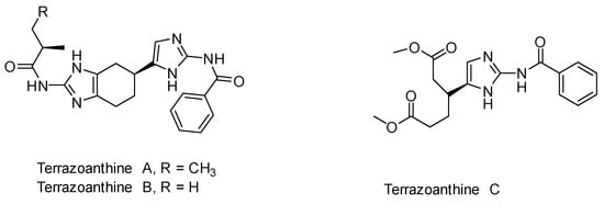The terrazoanthines (A–C) are a family of 2-aminoimidazole alkaloids isolated from the marine invertebrate group, the zoantharians, off the coast of Ecuador by Thomas et al. [1] These compounds give an insight into the chemical content of Terrazoanthus onoi. Terrazoanthine A and B both contain a previously unknown 6-(imidazol-5-yl)benzo[d]imidazole skeleton (Figure 1).