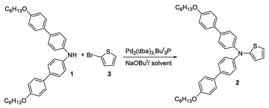 Synthesis of N,N-bis(4′-(hexyloxy)-[1,1′-biphenyl]-4-yl)thiophen-2-amine 2 (Supplementary Materials).