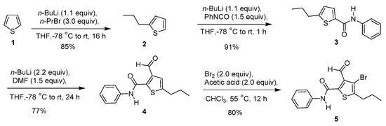 We synthesized 4-bromo-3-formyl-N-phenyl-5-propylthiophene-2-carboxamide by using three successive direct lithiations and a bromination reaction starting from thiophene. All these lithiation reactions were carried out at −78 °C to RT over a period of 1 to 24 h based on the reactivity of electrophile. This is a four-step protocol starting from thiophene with an overall yield of 47%.